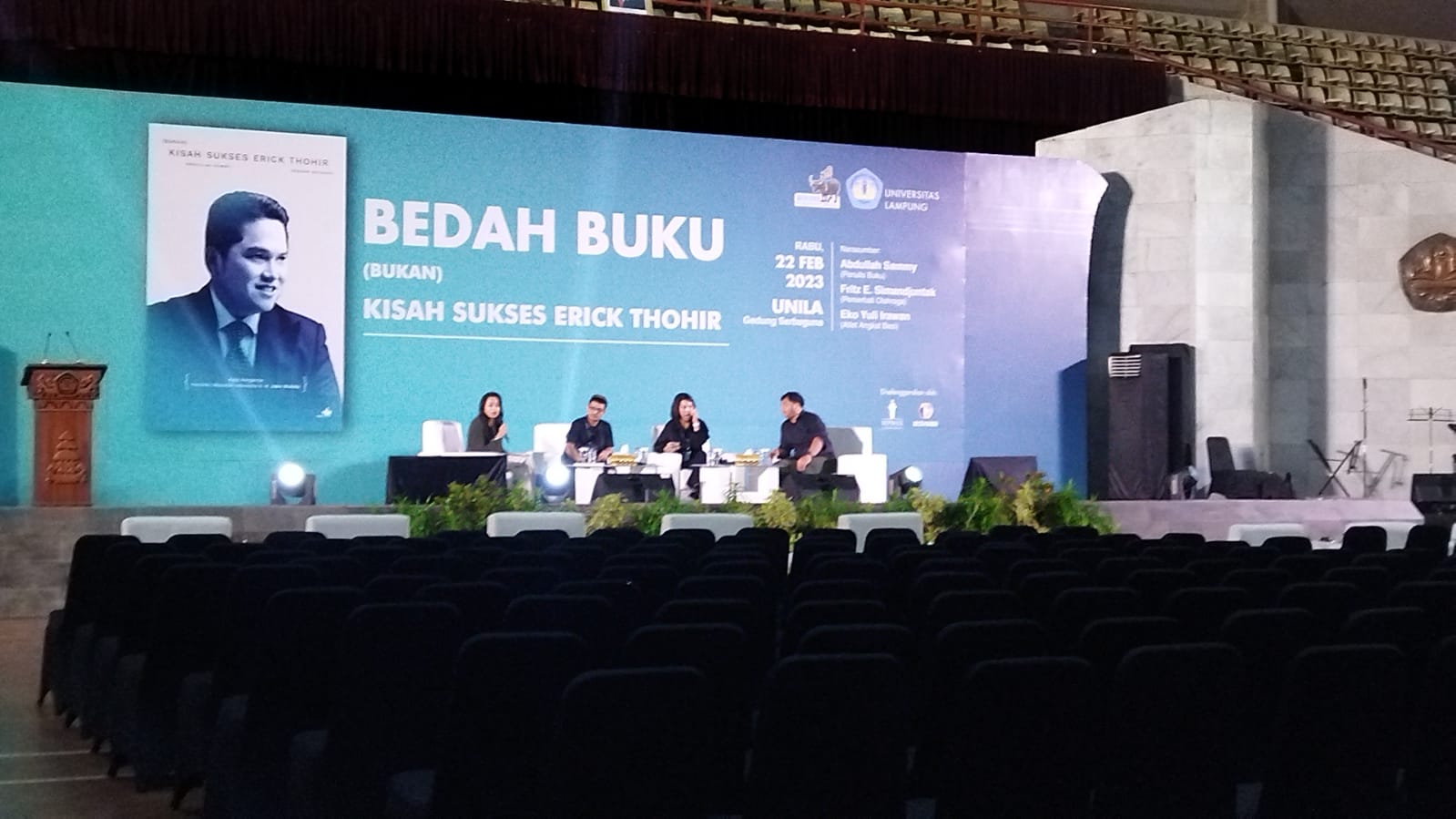 Bandar Lampung, www.lampungmediaonline.com Wakil Rektor Bidang Umum dan Keuangan Rudy, S.H., LL.M., LL.D., membuka acara Bedah buku “(Bukan) Kisah Sukses Erick Thohir” di Gedung Serba Guna (GSG) kampus setempat, Rabu 22 Februari 2023