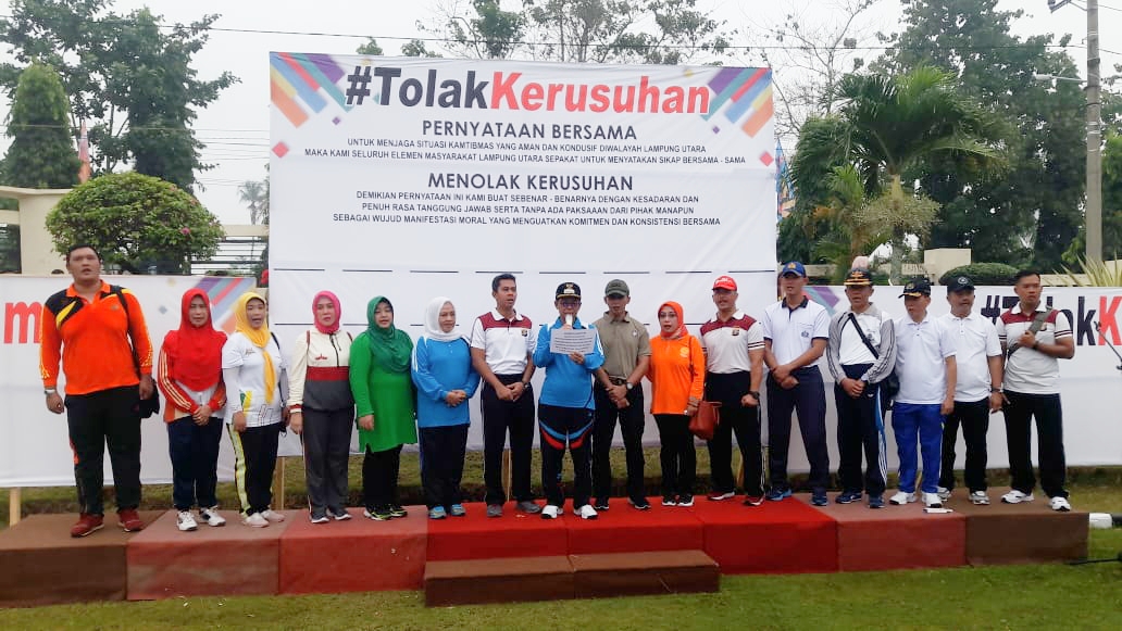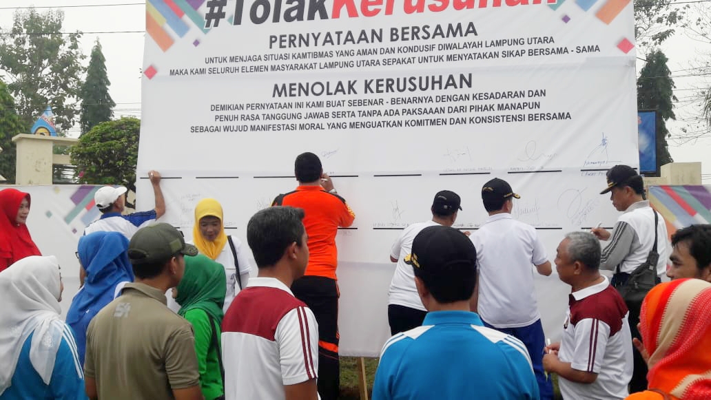Pernyataan bersama untuk menjaga situasi kamtibmas yang kondusif di wilayah Kab. Lampung Utara dan “Menolak Kerusuhan, NKRI Harga Mati” tersebut di pimpin oleh Wakil Bupati Lampung Utara Budi Utomo dengan diikuti seluruh elemen masyarakat yang hadir di acara tersebut.