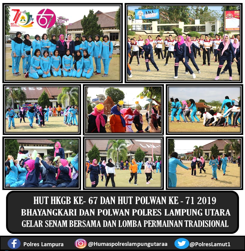 Hadir dalam kegiatan tersebut Kapolres Lampung Utara AKBP Budiman Sulaksono, S.I.K., Pejabat Utama, personil dan ASN Jajaran Polres Lampung Utara serta Ketua Bhayangkari Cab. Lampung Utara Ny. Dini Budiman beserta pengurus dan anggota. Olahraga bersama ini diawali dengan senam aerobik dengan dipandu instruktur senam dan dilanjutkan perlombaan permainan tradisional .