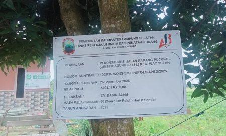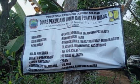Lampung Selatan, www.lampungmediaonline.com – Papan proyek kegiatan Rekonstruksi Jalan Karang Pucung – Sumber Agung (R.131) di Kecamatan Way Sulan, yang merupakan proyek...