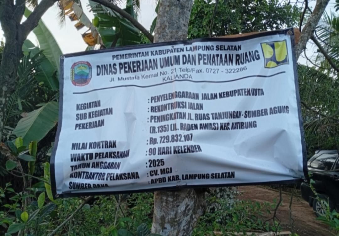 Lampung Selatan, www.lampungmediaonline.com Proyek peningkatan ruas jalan Tanjungan-Sumber Agung (Jalan Raden Awas) di Kecamatan Katibung, Lampung Selatan, senilai Rp729.832.107, kini menjadi sorotan publik. Proyek yang didanai dari APBD Lampung Selatan 2025 dan dikerjakan oleh CV. MGI dengan waktu pelaksanaan 90 hari kalender ini, menuai kritik tajam terkait profesionalitas pelaksana.