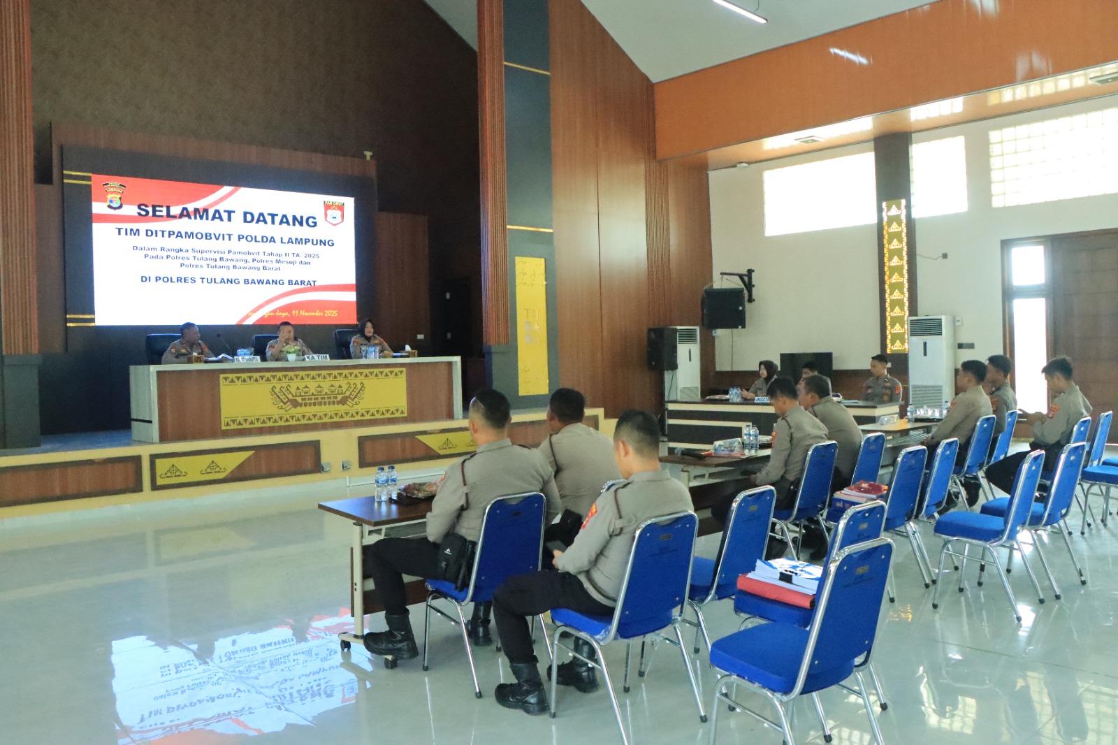 Polres Tubaba Polda Lampung menerima kunjungan Tim Supervis Direktorat Pengamanan Objek Vital (Ditpamobvit) Polda Lampung di Polres Tubaba diikuti oleh 3 Polres, yakni Polres Tubaba, Polres Mesuji, Polres Tulang Bawang, terkait dengan upaya Ditpamobvit Polda Lampung dalam menjaga standarisasi pelaksanaan tugas pengamanan objek vital di seluruh jajaran kepolisian di wilayah Lampung. Selasa (11/11/2025)