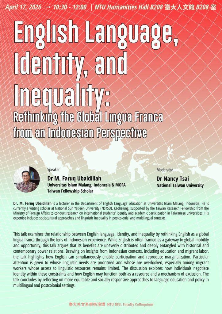 Undangan tersebut diberikan di tengah aktivitas akademik Dr. Faruq sebagai penerima program Taiwan Fellowship. Ia diundang secara langsung oleh peneliti senior di departemen tersebut, Nancy Tsai, untuk berbagi gagasan dan temuan riset terbaru. Dalam kuliah tamu tersebut, Dr. Faruq memaparkan hasil-hasil penelitiannya terkait aspek inequality (ketimpangan) dalam pengajaran bahasa Inggris di Indonesia, yang menjadi isu penting dalam kajian pendidikan bahasa di era global.