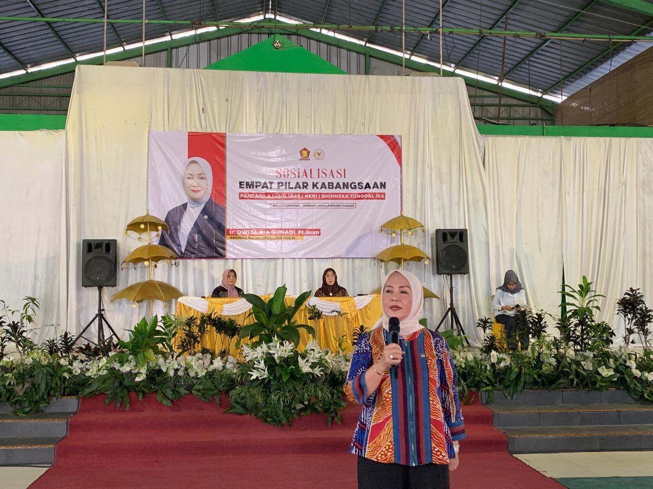 Lampung Tengah, www.lampungmediaonline.com – Anggota Badan Sosialisasi MPR RI, Ir. Dwita Ria Gunadi, M.Ikom, menggelar kegiatan Sosialisasi Empat Pilar Kebangsaan dengan tema “Empat Pilar Kebangsaan sebagai Fondasi Ketahanan Keluarga dan UMKM” di Aula Glompong, Bandarjaya, Lampung Tengah.