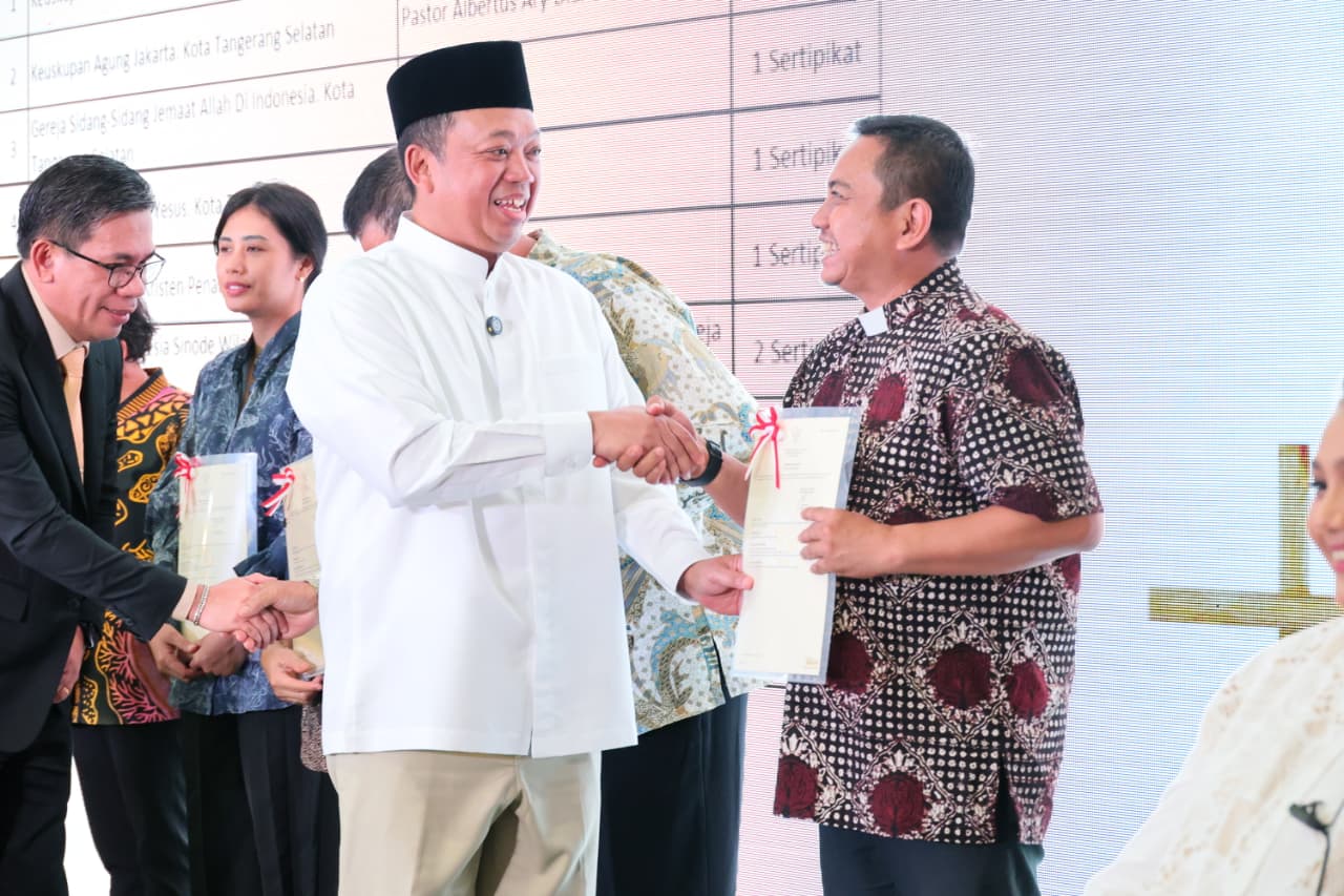 Pada kesempatan tersebut, Menteri Nusron yang didampingi Kepala Kantor Wilayah BPN Provinsi Banten turut menyerahkan 14 sertipikat rumah ibadah dan yayasan keagamaan kepada sembilan penerima sebagai bagian dari upaya memberikan kepastian hukum atas aset keagamaan.
