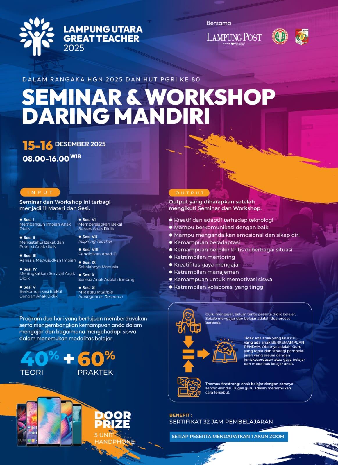 Kegiatan tersebut dikemas sebagai Seminar Motivasi Nasional Mandiri yang menyasar peningkatan kompetensi guru se-Lampung Utara. Pelaksanaan seminar dilakukan secara daring pada 15–16 Desember 2025, menghadirkan 12 sesi pembelajaran bermakna dari sejumlah pembicara dan motivator berskala nasional.