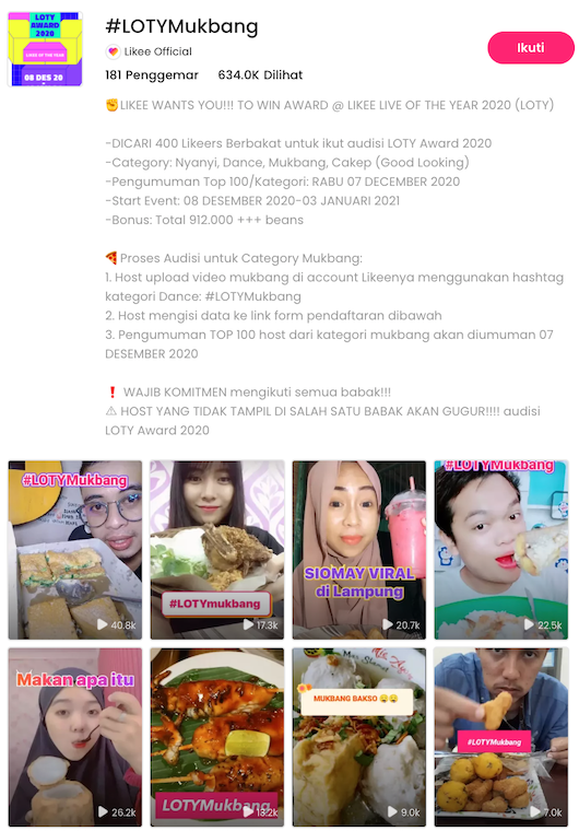 Likee LIVE of The Year 2020 (LOTY Award 2020) juga memberikan kesempatan yang sama bagi para konten kreator yang membuat konten di kategori mukbang atau rekaman saat makan. Dalam kategori #LOTYMukbang, para konten kreator yang suka berbagi pengalaman ketika sedang menyantap makanan dalam format video pendek, memiliki kesempatan yang sama untuk memenangkan berbagai hadiah berupa item spesial Likee juga lho!