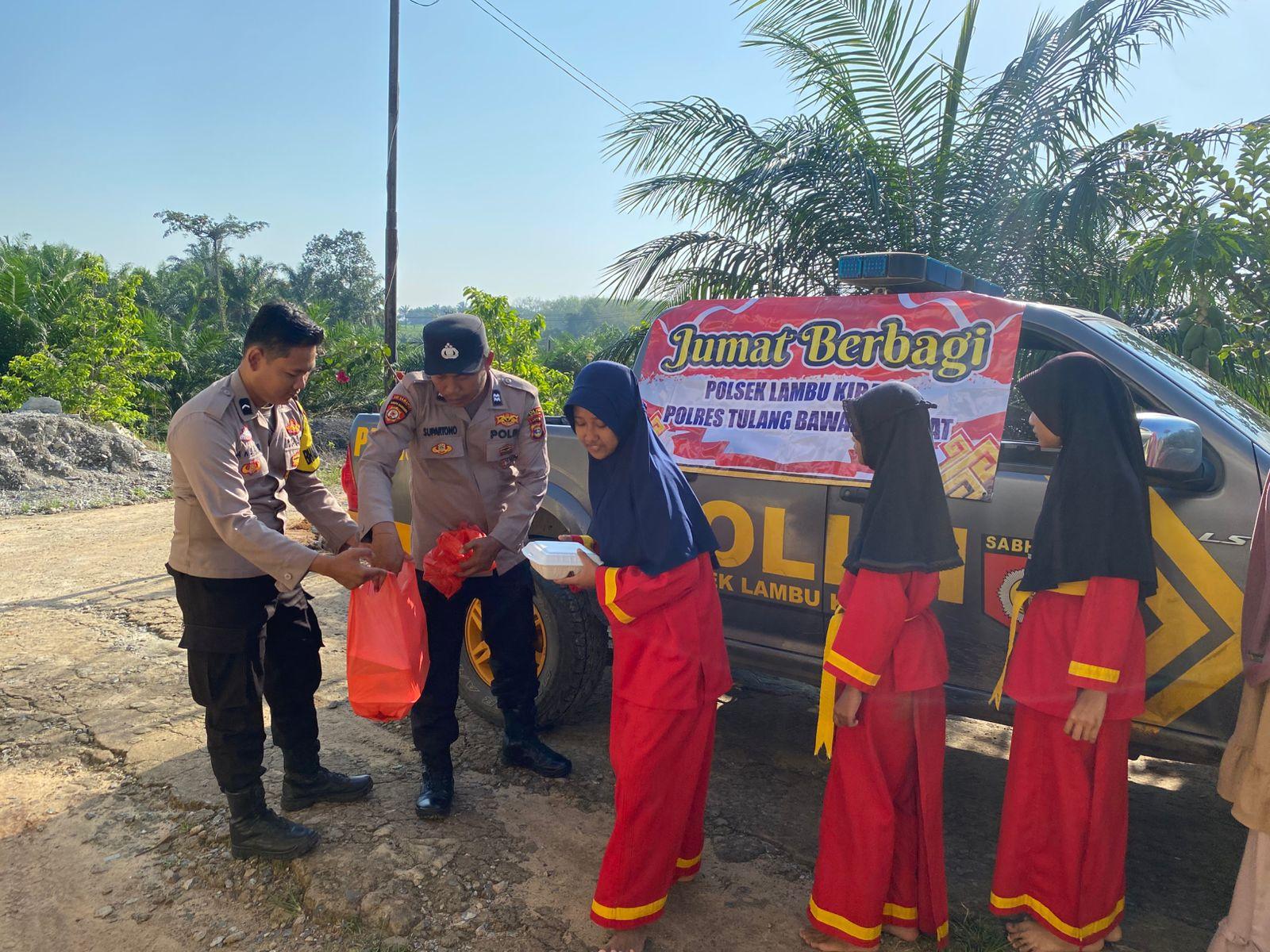 Dalam semangat berbagi di hari Jumat yang penuh berkah,Personil Polsek Lambu Kibang, Polres Tulang Bawang Barat Polda Lampung membagikan nasi kotak kepada Santri Pondok Pesantren Nurul Kirom Tiyuh Gunung Sari Jaya Kec. Lambu Kibang Kab.Tubaba, Jumat (05/09/2025). Pagi