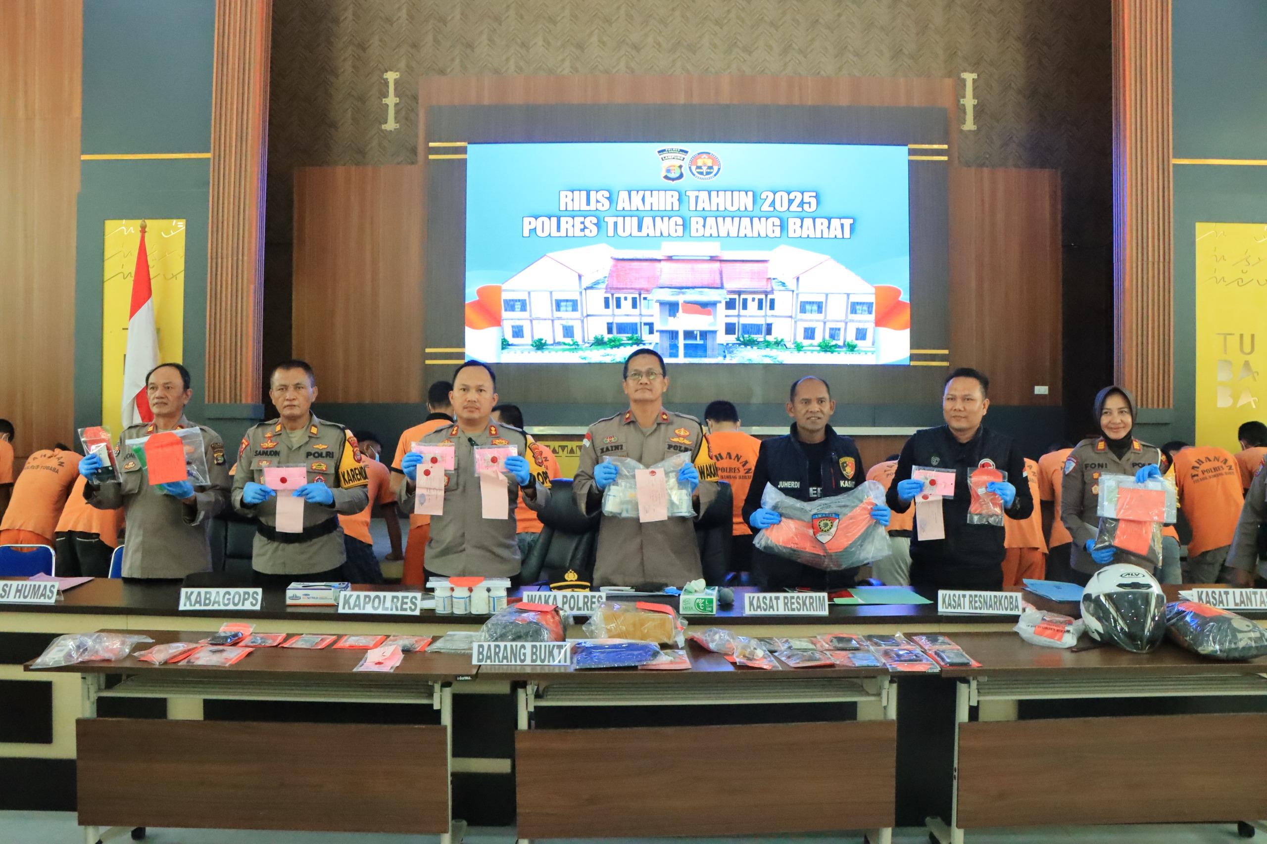 Polres Tulang Bawang Barat Polda Lampung Menggelar Rilis Akhir Tahun 2025 yang disampaikan langsung oleh Kapolres Tulang Bawang Barat AKBP Sendi Antoni, S.I.K., M.IK. dengan didampingi oleh Waka Polres, Kabag Ops, Kasat Reskrim, Kasat Narkoba, Kasat Lantas, Kasat Tahti, Kasi Propam, Kasi humas dan Para Kapolsek Jajaran Polres Tubaba, bertempat di Aula Sarja Arya Racana Pores Tulang Bawang Barat, Rabu (31/12/2025).