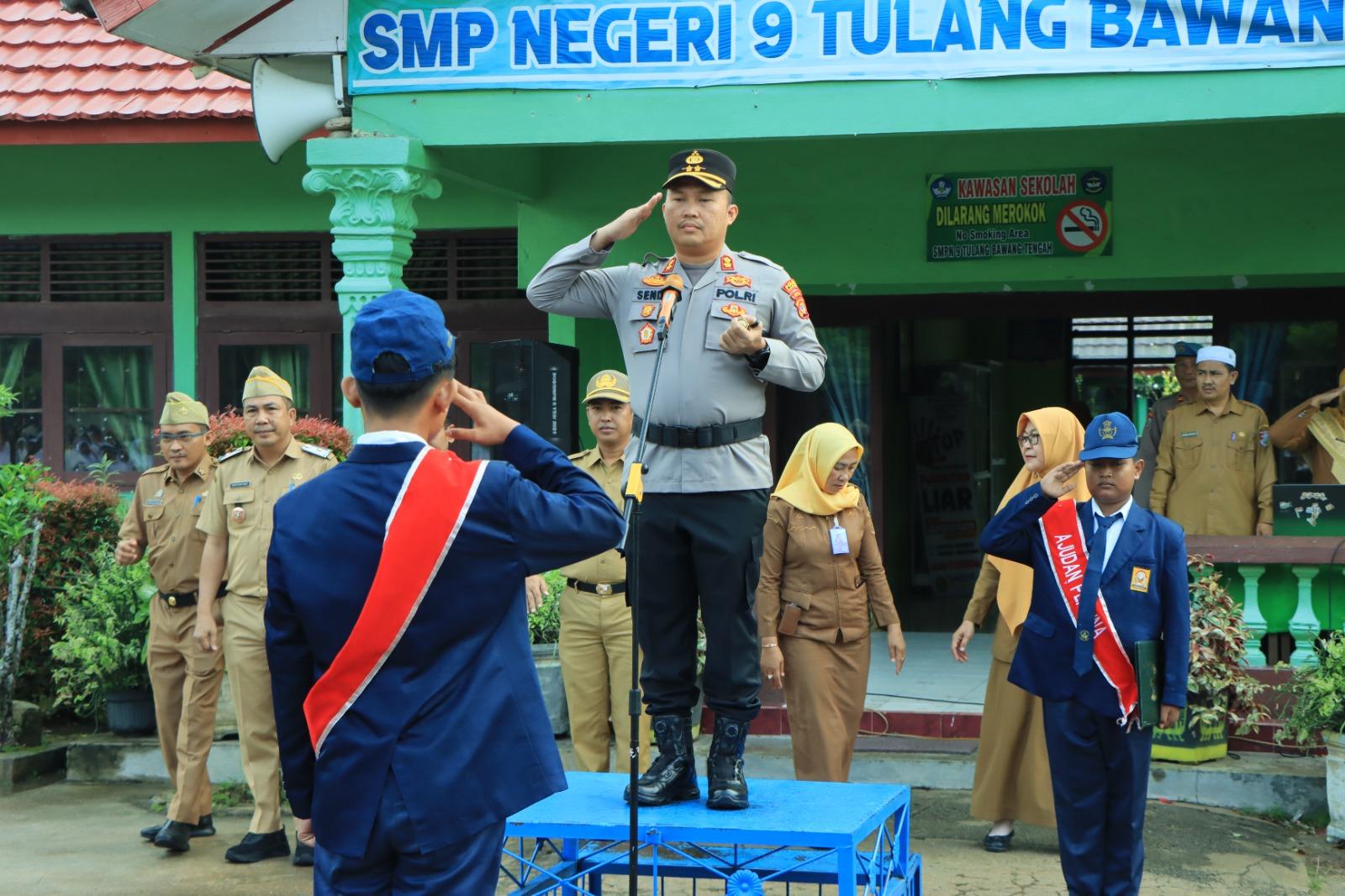 Bertindak sebagai menjadi Inspektur Upacara Bendera di SMPN 9 Tulang Bawang Barat Kapolres Tubaba AKBP Sendi Antoni, S.I.K., M.I.K., menekankan pentingnya menjaga ketertiban dan kedisplinan serta menjauhkan diri dari narkoba dan kenakalan remaja.