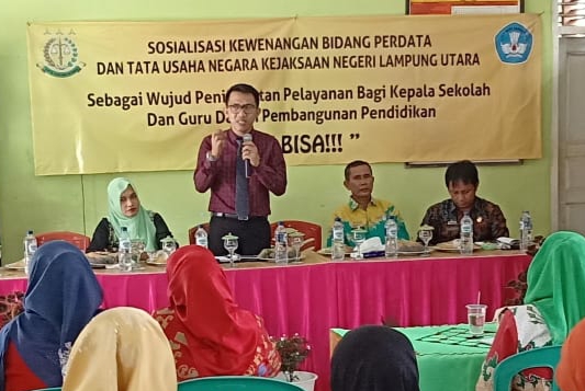 Kajari Lampura Yuliana Sagala, SH., MH, melalui Kepala Seksie Perdata dan Tata Usaha Negara (Kasie Datun), M. Reza melakukan sosialisasi kepada 48 Kepala sekolah yang berada di tiga kecamatan (Abung Selatan, Abungsemuli, Blambanganpagar). Usai melakukan sosialisasi, Reza mengatakan, kegiatan ini merupakan program rutin Jaksa Pengacara Negara (JPN) Kejari dalam mensosialisasikan kewenangan perdata dan tata usaha negara kepada para kepala sekolah. “Dengan demikian para kepala sekolah mendapatkan pengetahuan hukum, pertimbangan hukum dan pelayanan hukum khususnya di bidang perdata,” ujar Reza di SDN 3 Kembang tanjung Abung Selatan