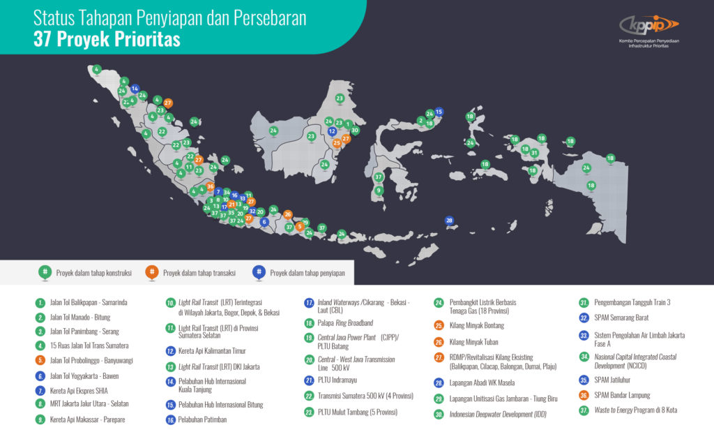 Sedangkan untuk 37 proyek yang masuk kategori Proyek Prioritas, hingga Desember 2017, sebanyak 20 proyek telah memasuki tahap konstruksi, 5 proyek dalam proses transaksi,dan 12 proyek masih dalam tahap penyiapan. Proyek Jalan Tol Balikpapan-Samarinda, MRT Jakarta Koridor North-South, Palapa Ring Broadband, PLTU Batang, dan Tangguh LNG Train 3 adalah beberapa contoh Proyek Prioritas yang telah mencapai tahap konstruksi.