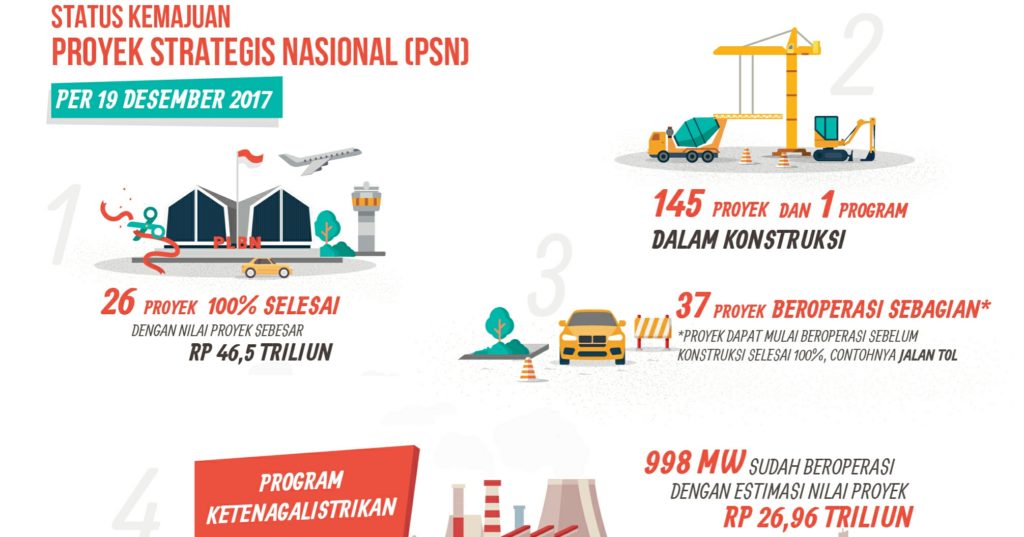 Jakarta.www.lampungmediaonline.com-pemerintah telah merampungkan proyek PSN sebanyak 26 proyek, dengan rincian 20 proyek diselesaikan pada tahun 2016 dan 6 proyek diselesaikan pada tahun 2017 dengan estimasi total nilai investasi sebesar Rp 46,5 Triliun. Adapun daftar 6 proyek yang telah selesai pada tahun 2017 adalah Jalan Akses Tanjung Priok, PLBN Nanga Badau Kab. Kapuas Hulu, PLBN Aruk Kab. Sambas, dan PLBN Wini Kab. Timor Tengah Utara, jalan tol Soreang – Pasirkoja dan jalan tol Surabaya – Mojokerto, dengan nilai proyek secara keseluruhan mencapai Rp 13,1 Triliun.