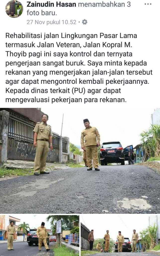“Saya minta kepada rekanan yang mengerjakan untuk dapat mengontrol kembali pekerjaannya.kepada dinas terkait (PU) agar dapat mengevaluasi pekerjaan rekanan.”Ujarnya yang dituangkan dalam tulisan status facebook akun miliknya itu.