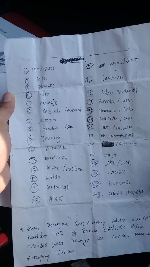 Lampung Selatan, www.lampungmediaonline.com – Diduga bagi-bagi uang untuk mendukung salah satu calon kepala desa, 4 orang warga Desa Triharjo Kecamatan Merbau Mataram, Lampung Selatan diamankan warga jelang hari pencoblosan pilkades serentak lalu. Bahkan salah satu pelakunya ditenggarai sebagai anggota panitia pemilihan desa.