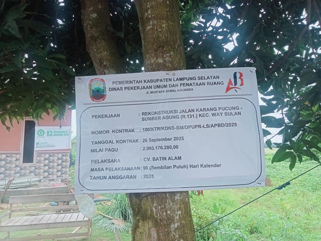 Lampung Selatan, www.lampungmediaonline.com – Papan proyek kegiatan Rekonstruksi Jalan Karang Pucung – Sumber Agung (R.131) di Kecamatan Way Sulan, yang merupakan proyek Dinas Pekerjaan Umum dan Penataan Ruang (PUPR) Kabupaten Lampung Selatan, menuai kritik dari warga. Pasalnya, plang proyek bernilai miliaran rupiah tersebut dipasang di batang pohon mangga di pinggir jalan.