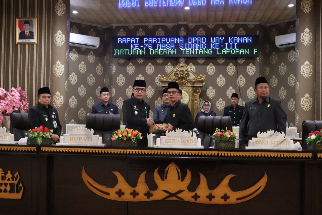 Raperda pertanggungjawaban atas pelaksanaan APBD ini memuat Informasi keuangan Tahun Anggaran 2018 yang telah diaudit oleh BPK-RI beberapa waktu yang lalu, mendapat predikat Opini Wajar Tanpa Pengecualian (WTP) untuk yang ke-9 (sembilan) kalinya Kabupaten Way Kanan memperoleh opini tertinggi dari BPK-RI atas penilaian terhadap Laporan Pertanggungjawaban Keuangan, yang tentunya ini buah kerja keras kita semua, baik eksekutif maupun legislatif.