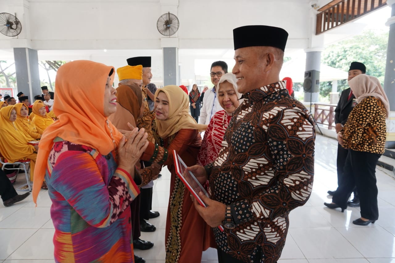 Lampung selatan. Www.lampungmediaonline.com – Nur Munasih (63) tidak bisa menahan haru saat dirinya menerima piagam penghargaan dari Pelaksana tugas (Plt) Bupati Lampung H. Nanang Ermanto. Nur Munasih merupakan istri dari almarhum Munatsir Amin sang pencipta lagu Mars Lampung Selatan yang yang menerima penghargaan dari orang nomor satu di Kabupaten Khagom Mufakat.