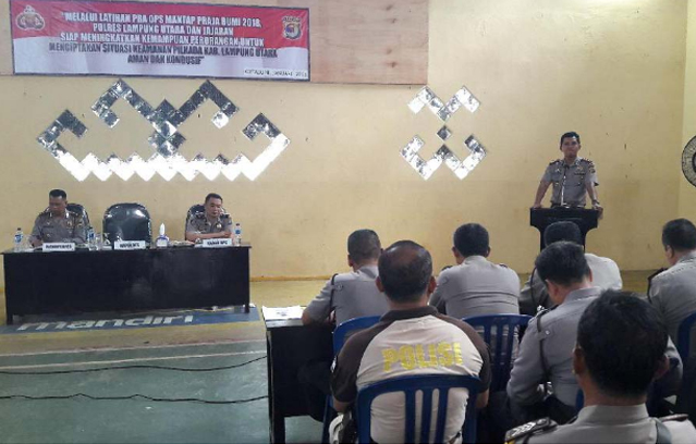 Kegitan tersebut dilaksanakan di Gedung Serba Guna Polres Lampung Utara dan di hadiri oleh Kapolres Lampung Utara AKBP Eka Mulyana, S.I.K, Wakapolres Kompol Suparman, Spd, Msi, Kabag Ops Kompol Handak Prakasa Q, ST, MH, para Kabag, Kasat dan Kapolsek jajaran Polres Lampung Utara serta seluruh anggota yang terlibat dari Sprin Lat Pra Ops Mantap Praja Bumi 2018.