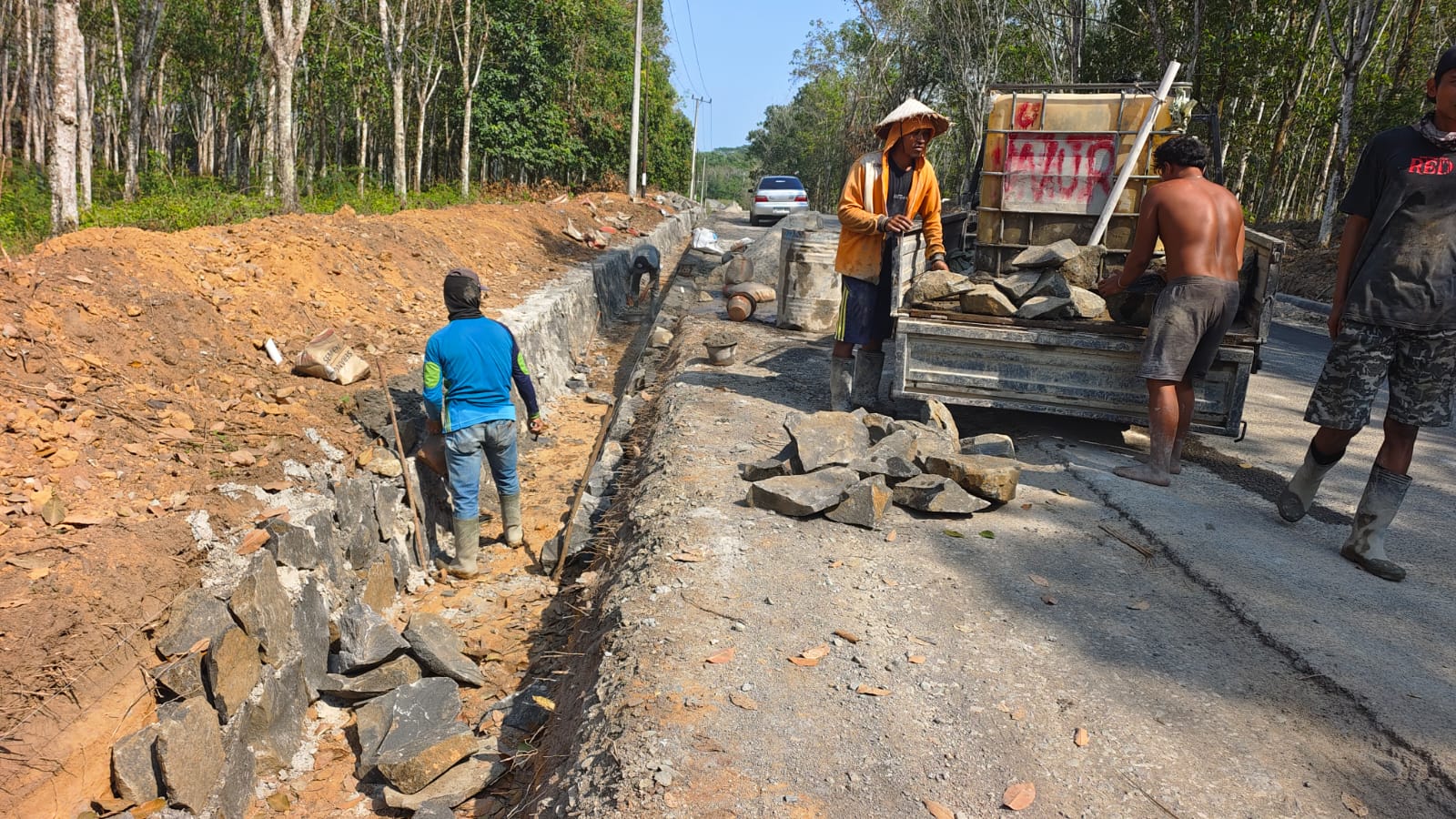 “Material drainase yang saya kerjakan hanya 5 angkong pasir, satu sak semen, dan batu bersandar di dinding tanah talud,” ucapnya.