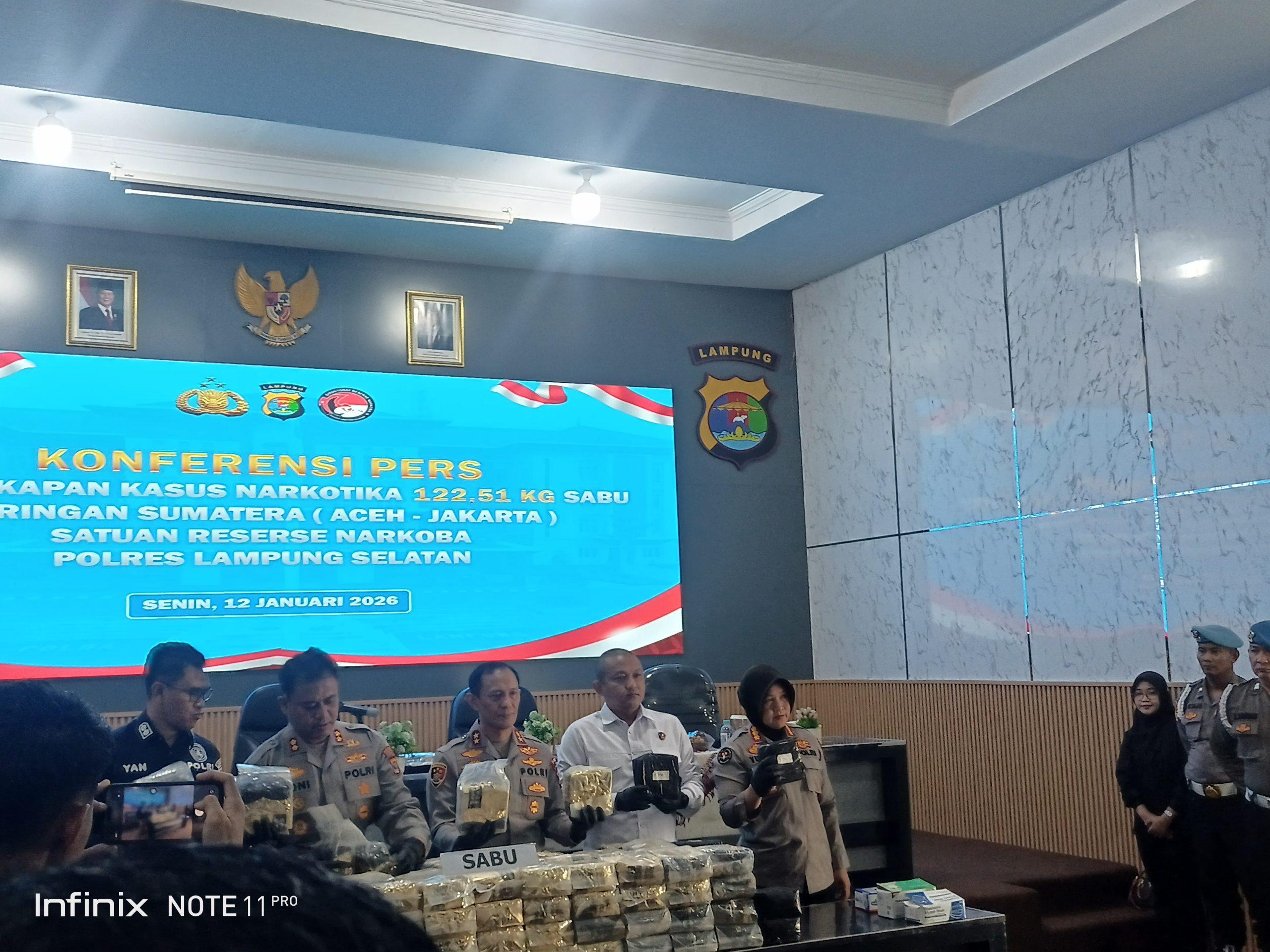 LAMPUNG, www.lampungmediaonline.com – Upaya penyelundupan narkotika dalam jumlah fantastis kembali digagalkan aparat kepolisian. Satuan Reserse Narkoba Polres Lampung Selatan berhasil membongkar pengiriman 122,51 kilogram sabu yang dikamuflase di balik muatan 8 ton jengkol di area Seaport Interdiction Pelabuhan Bakauheni, Lampung Selatan.