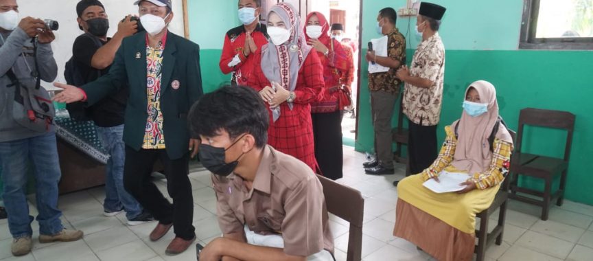 Lampung Selatan, www.lampungmediaonline.com Duta vaksin Lampung Selatan Hj. Winarni Nanang Ermanto meninjau pelaksanaan vaksinasi Covid-19 bagi pelajar usia 12-17 tahun yang dipusatkan di SD Negeri 1 Sidodadi Kecamatan Sidomulyo, Sabtu (2/10/2021).
