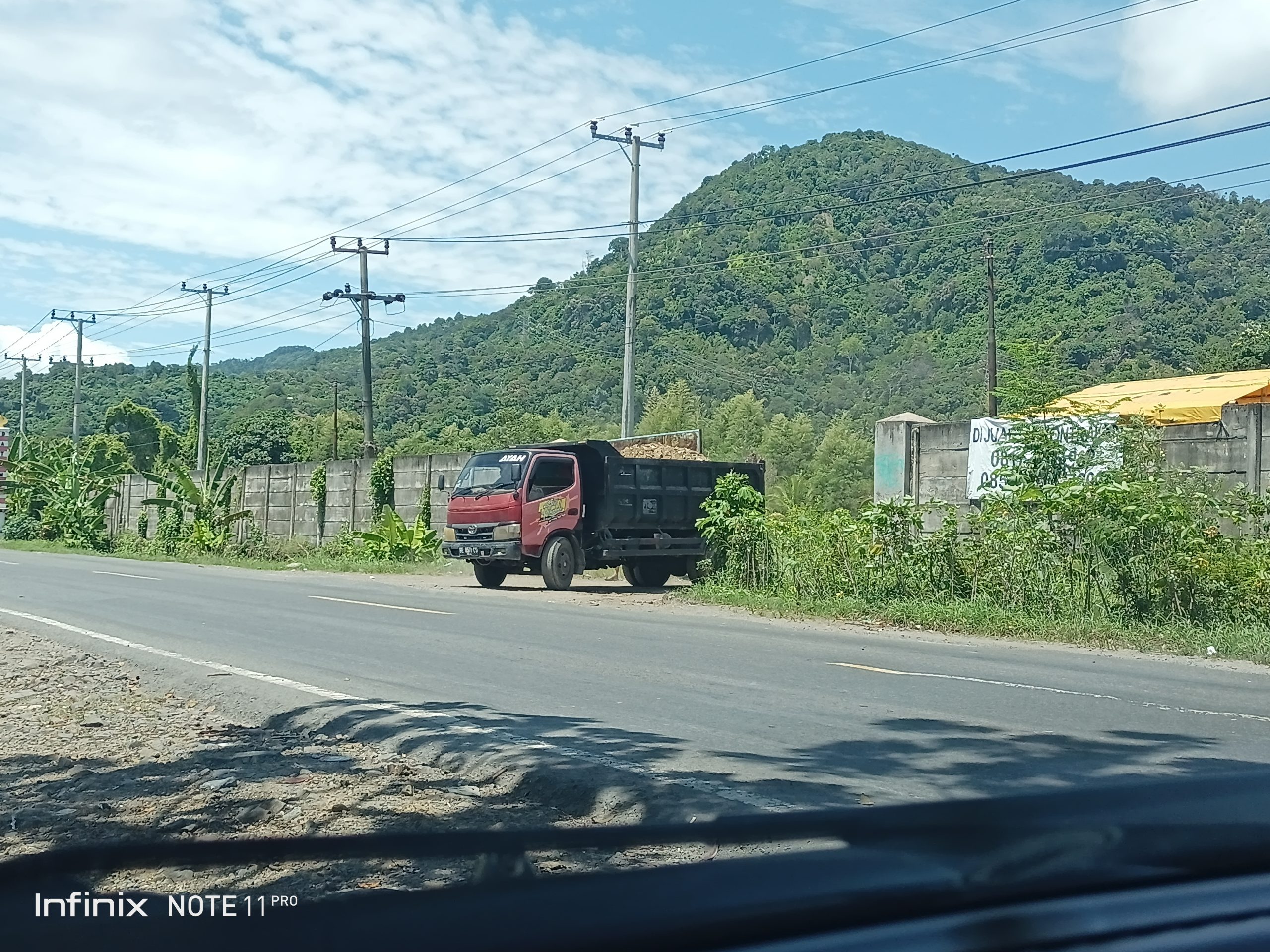 Terlihat sejumlah kendaraan jenis dum truk mengangkut material dari area tambang tersebut. Aktivitas tersebut berlangsung secara terbuka, tanpa papan informasi proyek atau izin operasi yang lazimnya terpasang di lokasi pertambangan resmi.