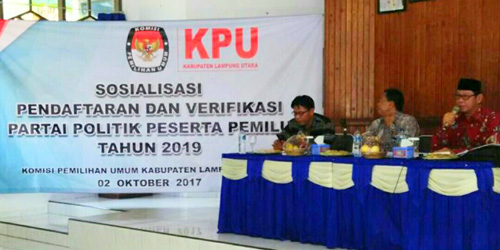 Lampung Utara, www.lampungmediaonline.com – Komisi Pemilihan Umum (KPU) Kabupaten Lampung Utara melakukan sosialisasi verifikasi partai politik (Parpol) untuk pemilu legislatif tahun 2019 mendatang,bertempat di Gedung Korpri Kotabumi, senin(02/10).Hadir pada acara tersebut perwakilan parpol, Kesbangpol, Polres dan Kodim 0412.