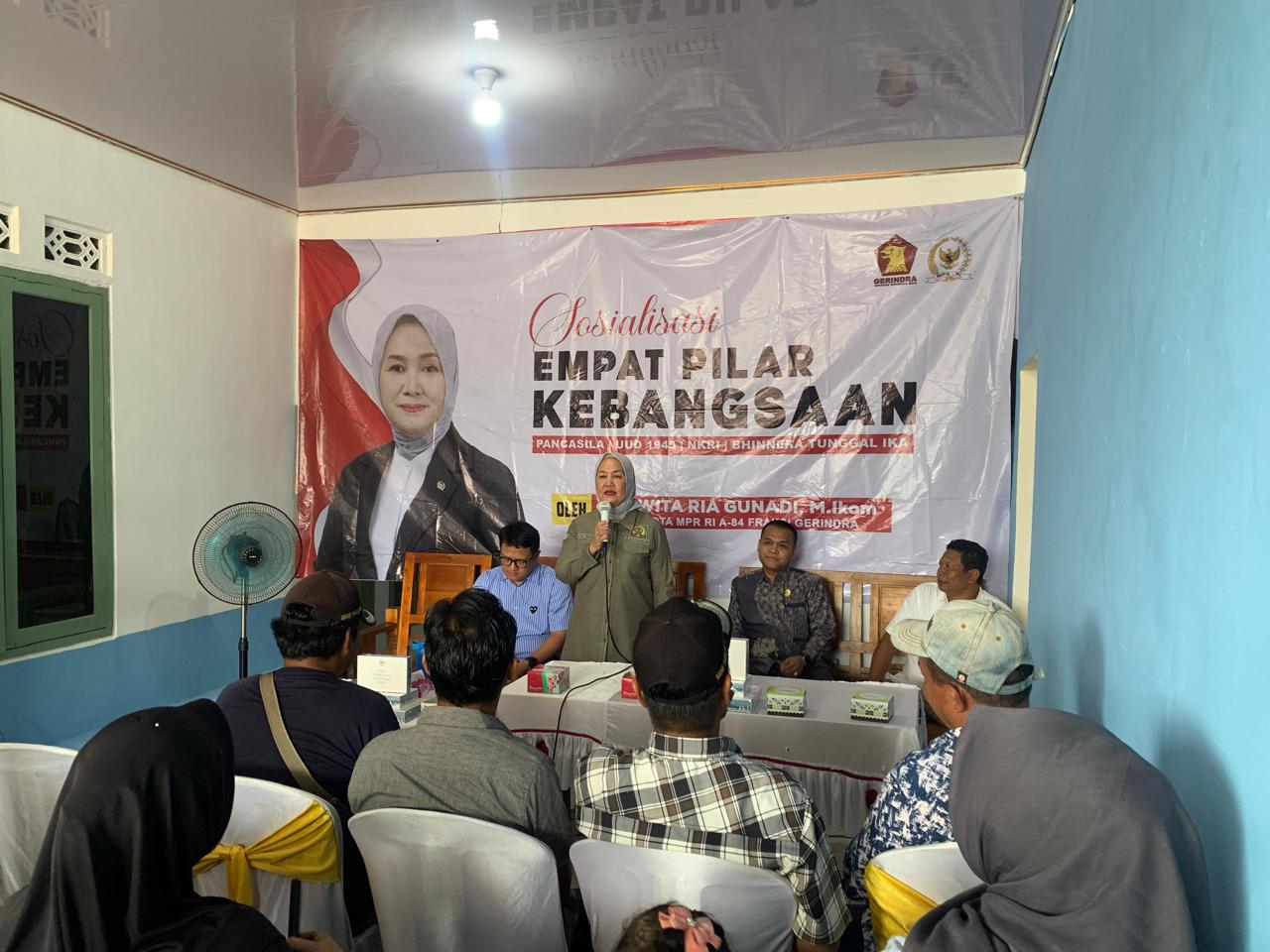 Lampung Timur, www.lampungmediaonline.com — Anggota MPR RI dari Fraksi Partai Gerindra, Ir. Dwita Ria Gunadi, melaksanakan kegiatan Sosialisasi Empat Pilar Kebangsaan di Kecamatan Waway Karya, Lampung Timur. Acara berlangsung selepas salat Isya dan dihadiri oleh tokoh masyarakat, tokoh agama, pemuda, serta para perangkat desa di wilayah setempat.
