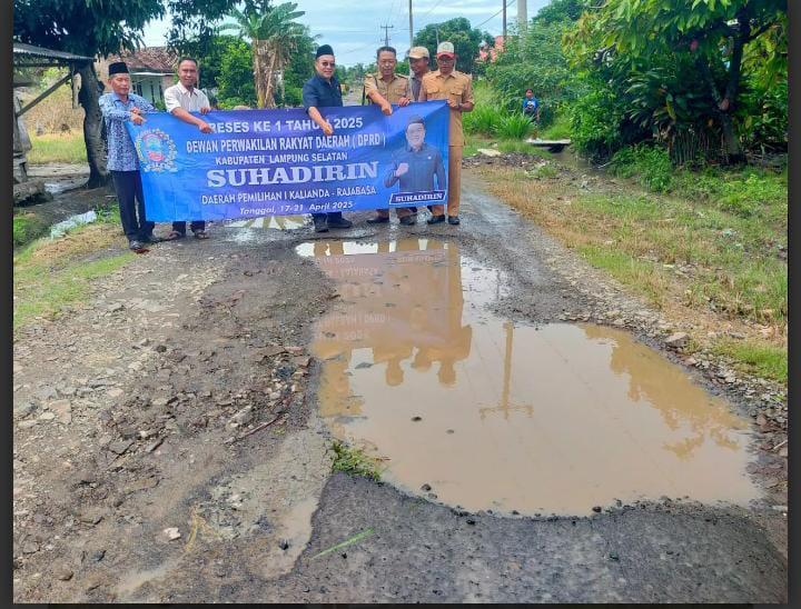 lampungselatan, www.lampungmediaonline.com Suhadirin Anggota DPRD Lampung Selatan dari Fraksi Nasdem tinjau jalan di Dusun Sukabakti Desa Sukatani Kecamatan Kalianda Lampung Selatan yang telah bertahun-tahun dengan kondisi rusak parah, minggu (20/4/2025)