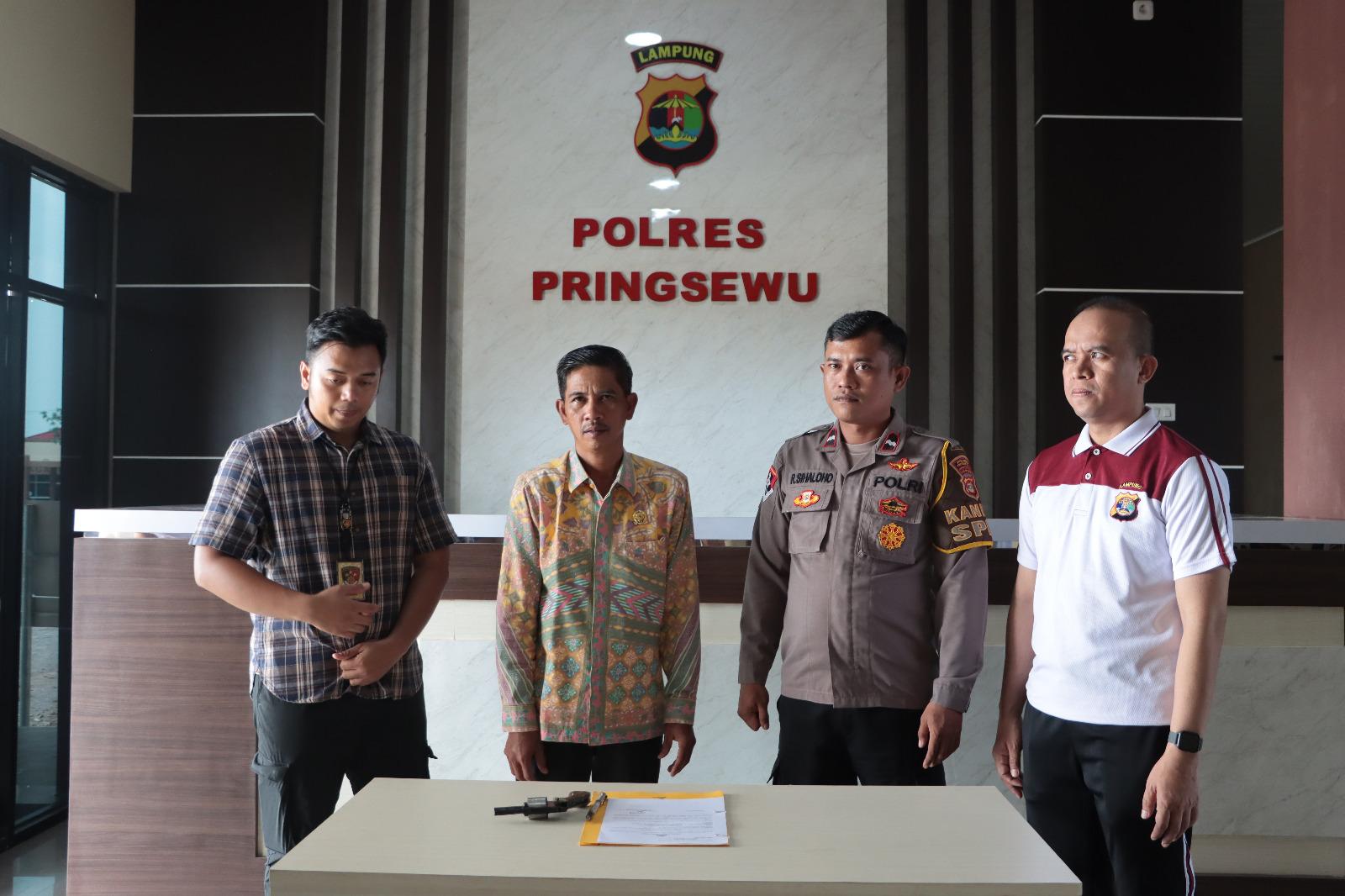 Penyerahan senpi ini disaksikan langsung Kapolres Pringsewu AKBP Benny Prasetya dan Kasat Reskrim Iptu Feabo Adigo Mayora Pranata.