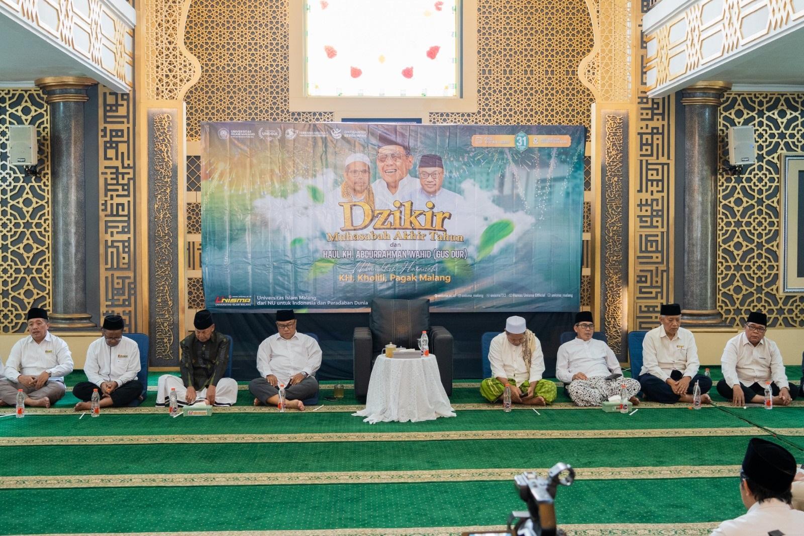 Rektor UNISMA, Prof. Drs. Junaidi, M.Pd., Ph.D., dalam sambutannya menyampaikan bahwa perjalanan tahun 2025 telah sampai pada hari terakhir. Momentum akhir tahun ini, menurutnya, menjadi saat yang tepat untuk berdzikir dan bermuhasabah, sekaligus mengenang keteladanan Gus Dur yang telah wafat 16 tahun silam.