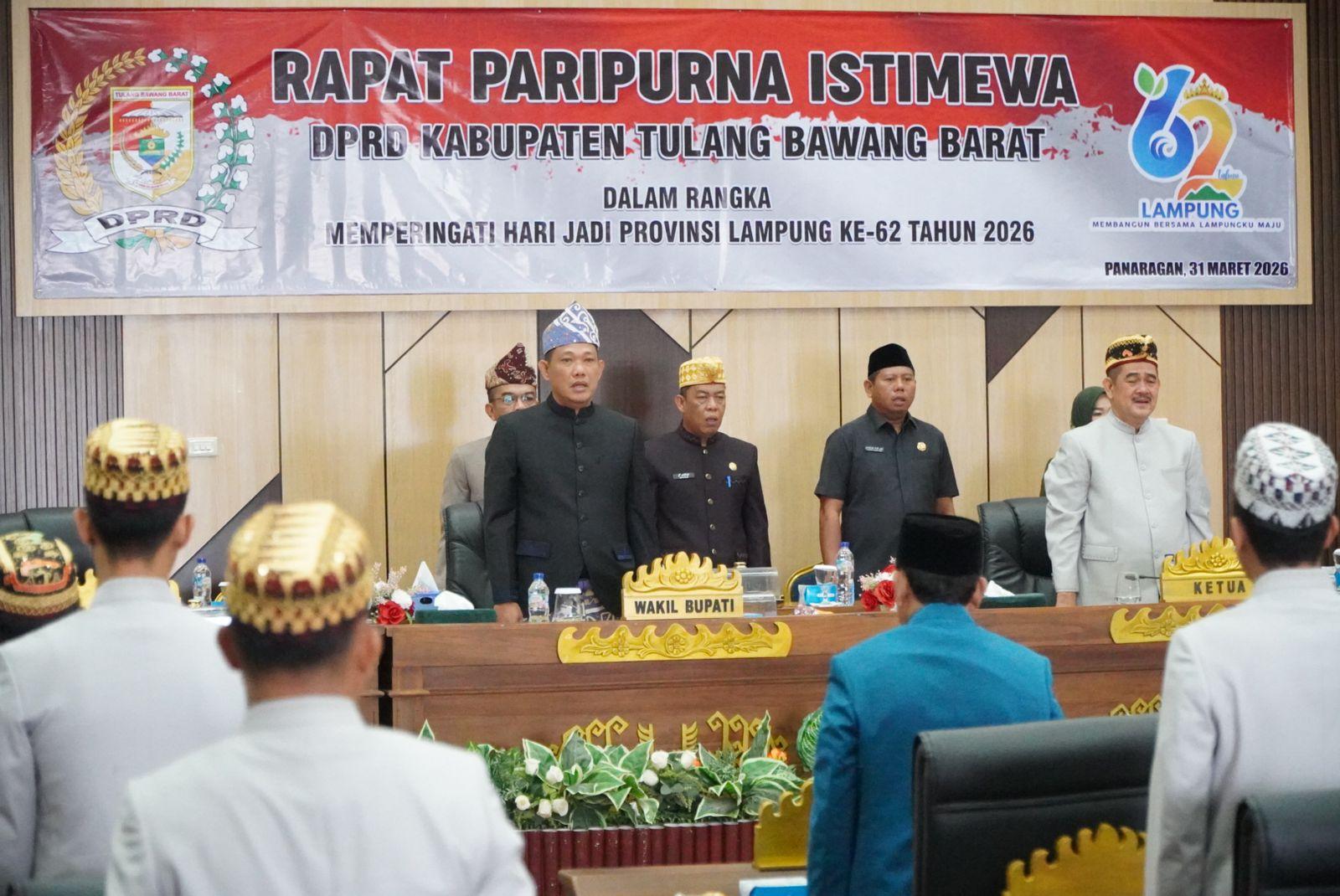 Wakil Bupati Tulang Bawang Barat (Tubaba), Nadirsyah, membacakan sambutan Gubernur Lampung, Rahmat Mirzani Djausal, dalam Sidang Paripurna Istimewa DPRD Tubaba memperingati Hari Jadi ke-62 Provinsi Lampung, Selasa (31/03/2026). Kegiatan berlangsung di Lantai II Ruang Rapat DPRD Tubaba dan dihadiri unsur pimpinan serta anggota DPRD, Forkopimda, Ketua TP-PKK, Ketua I TP-PKK, beserta jajaran pemerintah daerah, tokoh masyarakat, hingga insan media.